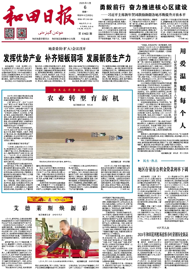 2024年,全地区粮食种植面积达373.4万亩,同比增长29.9%。戈壁沙漠设施农业发展、高标准农田建设、农业机械化高质量发展……各项工作相互促进、协同发展,共同推动和田农业转型升级,一幅农业强、农村美、农民富的乡村振兴画卷徐徐铺展。