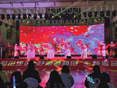 紧接着,各种形式的歌唱表演精彩上演。合唱、独唱、二重唱等多样的演唱形式交织,为观众带来了一场视听盛宴。一首首经典歌曲,在演唱者饱含深情的演绎下,唱出了对祖国的热爱、对美好生活的赞美,也展现了和田人民积极向上的精神风貌。