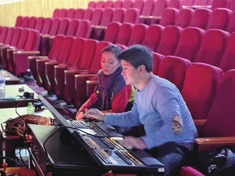 和田影剧院内,灯光不断闪烁,工作人员细致对光,确保每一个节目在演出时都能呈现最佳灯光视觉效果;调音师专注于音响设备的调试;演员在舞台上挥洒汗水,歌舞排练紧张而有序;主持人认真地练词;录音、视频制作等工作也在有条不紊地进行着……