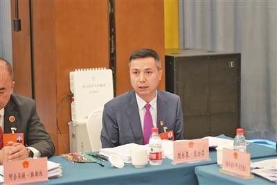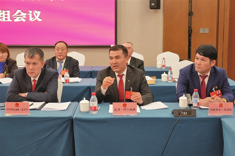 自治区人大代表、洛浦县玉都水务公司职工艾力·阿卜杜拉(中)在审议时,畅谈民生改善情况。