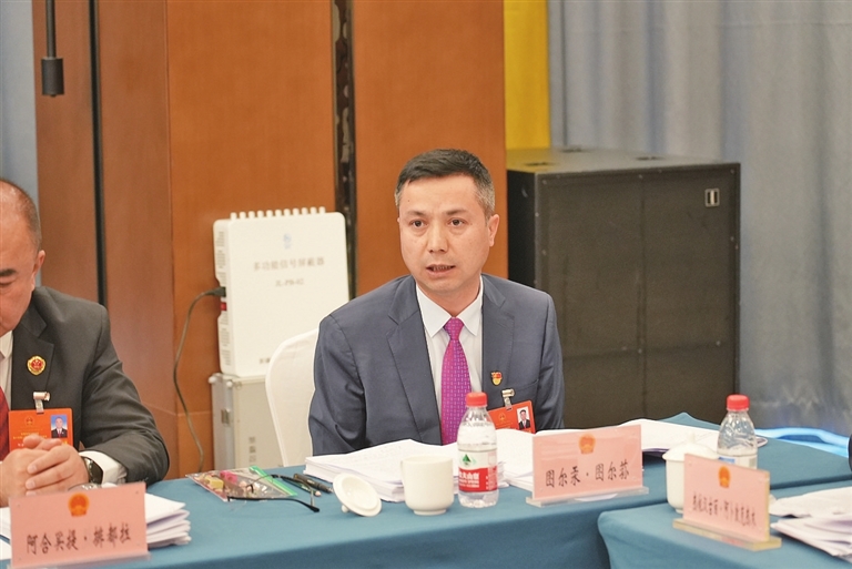 自治区人大代表、于田县奥依托格拉克乡托格拉吾斯塘村村民吾而也提·吾加不拉在审议时,畅谈稳定就业带来的变化。