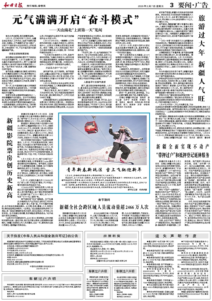 - 旅游过大年 新疆人气旺 蛇年春节假期,新疆文化和旅游市场热辣滚烫。来自自治区文化和旅游厅的数据显示:1月28日至2月4日,全区累计接待游客794.25万人次,同比增长10.04%;游客消费80.75亿元,同比增长9.35