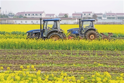 2月25日,在沅江市草尾镇乐园村,村民操作旋耕机翻耕芥兰绿肥。