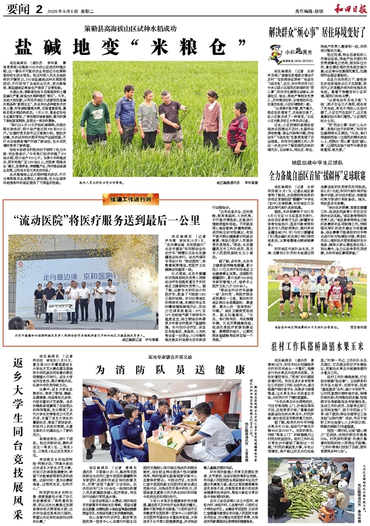 - 为消防队员送健康 地区融媒讯 (记者 唐海东 通讯员 王雪莲)8月1日,解放军总医院联合北京同仁堂中医医院援疆帮扶专家团队走进和田地区消防救援支队,开展“送医下基层”义诊活动。此次活动专门为100余名一线消