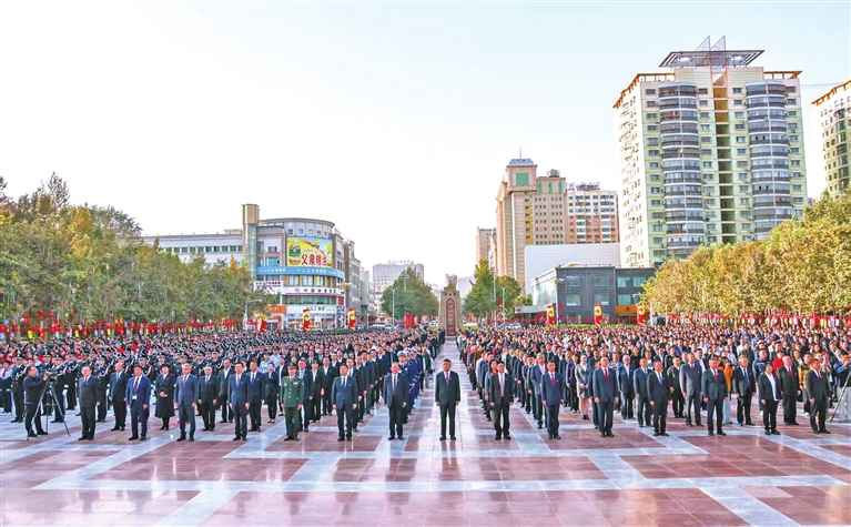 上午10时,升国旗仪式正式开始。国旗护卫队迈着整齐步伐护卫五星红旗走向升旗台。伴随着雄壮的《义勇军进行曲》,五星红旗冉冉升起,全场人员肃立行注目礼,少先队员行队礼,嘹亮的国歌在广场上空回荡。