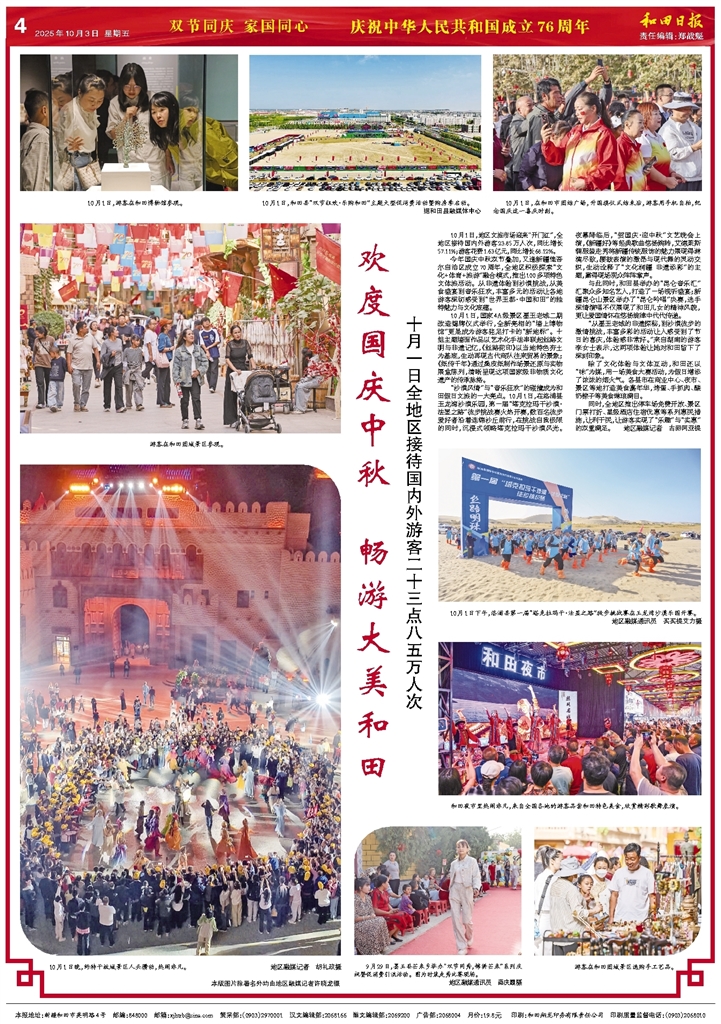 10月1日,地区文旅市场迎来“开门红”,全地区接待国内外游客23.85万人次,同比增长57.11%;游客花费1.63亿元,同比增长68.12%。 今年国庆中秋双节叠加,又逢新疆维吾尔自治区成立