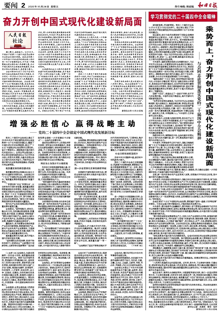 - 乘势而上,奋力开创中国式现代化建设新局面 谋划新蓝图,开创新局面。党的二十届四中全会10月20日至23日在北京举行。会议审议通过了《中共中央关于制定国民经济和社会发展第十五个五年规划的建议》。 会议期间,部分与会同志围绕学习领会全会精