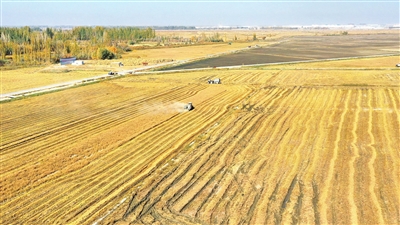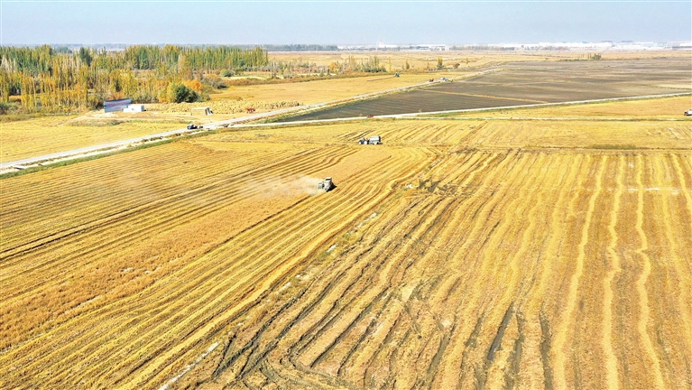 10月28日,和田市拉斯奎镇托万库勒来克村3000亩水稻迎来集中收割期。田野间,4台大型收割机往来穿梭,颗粒饱满的稻穗被迅速收入机舱,脱粒、碎秆一气呵成,高效便捷。“以前自家种玉米、小麦,一亩地收几百公斤,收入除去成本剩不下多少。现在土地流转给公司,不仅每年能拿固定租金,我在地里干活还能挣工资,今年务工挣了4.2万元。”村民阿卜杜热合曼·阿卜杜伊米提开心地说。