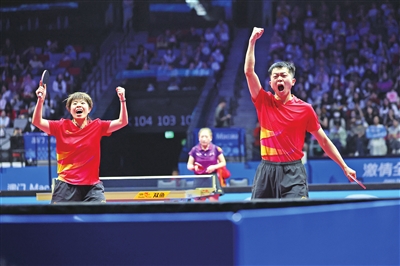 当日,在澳门举行的第十五届全国运动会乒乓球混合双打半决赛中,广东队组合林高远/刘诗雯4比3战胜辽宁队组合袁励岑/王艺迪,晋级决赛。新华社记者 梁旭摄