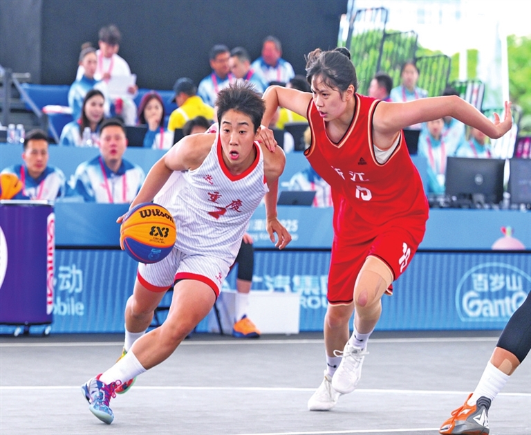 11月13日,重庆队球员阿呷娜婧(左一)在比赛中突破。 当日,在澳门举行的第十五届全国运动会三人篮球女子组小组赛中,浙江队17比13胜重庆队。 新华社发 张金加摄