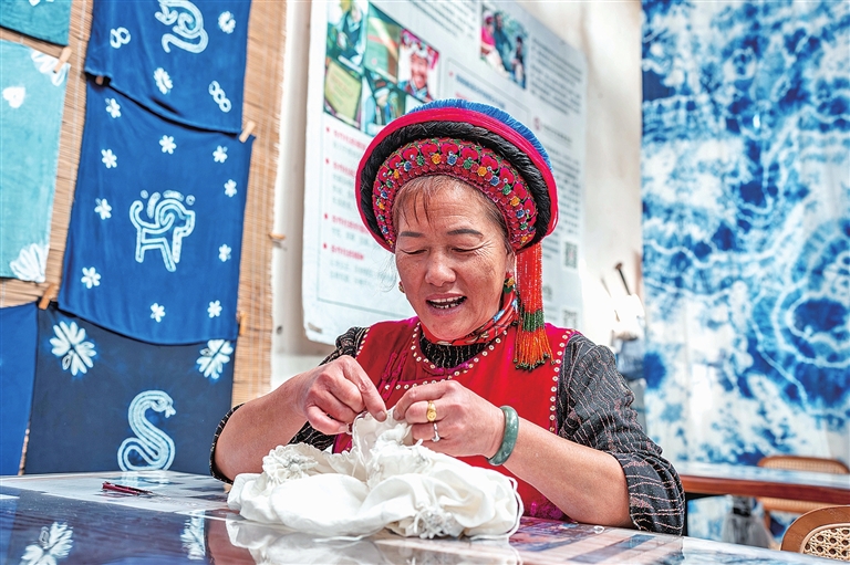 白族扎染以板蓝根为主要染料,工序包含绘图、制版、印花、扎花、染色、漂洗、拆花、晾晒等。其中,扎花、浸染为核心步骤,手工艺人执针走线,在布料上扎出不同类型的图案,再用植物染料染出蓝底白花、生灵百态。2006年,白族扎染被列入第一批国家级非物质文化遗产名录。新华社记者 胡超摄