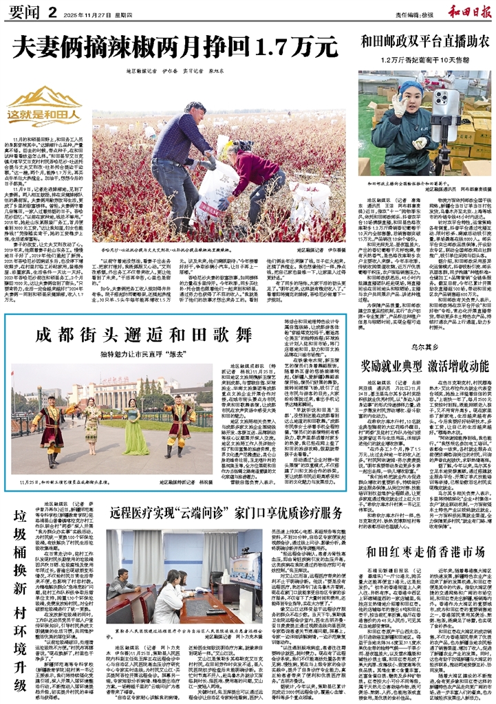 - 夫妻俩摘辣椒两月挣回1.7万元 11月的和硕县田野上,和田务工人员的身影穿梭其中。“这辣椒什么品种,产量真不错。回去的时候,带点种子,在和田试种看看效益怎么样。”和田县罕艾日克镇尤喀罕艾日克村村民吾哈尼沙·吐送托合提与丈夫艾则孜