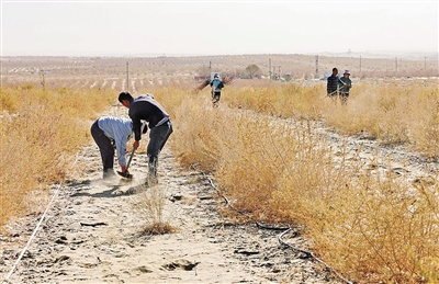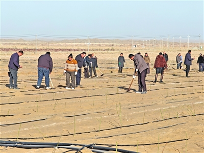 11月28日,记者在于田县万花园防沙治沙示范区看到,村民们正在今年新平整的5000亩沙地上栽种玫瑰苗。11月以来,于田县奥依托格拉克乡巴依拉克村村民买买提明·吐地每天都在地里忙碌着。去年,他在锁边区域周边种植的40亩玫瑰花,成活率达90%以上,今年,他计划再承包100亩地。