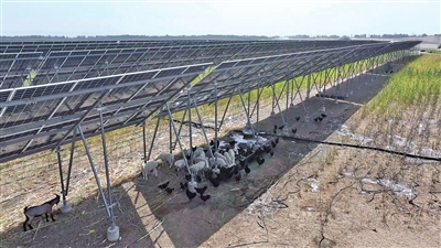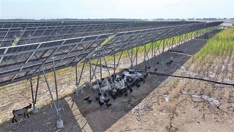 经过一年的试点,如今洛浦县的这处光伏发电站实现了光伏板上发电、光伏板下养殖,逐步形成了一个区域生态系统。