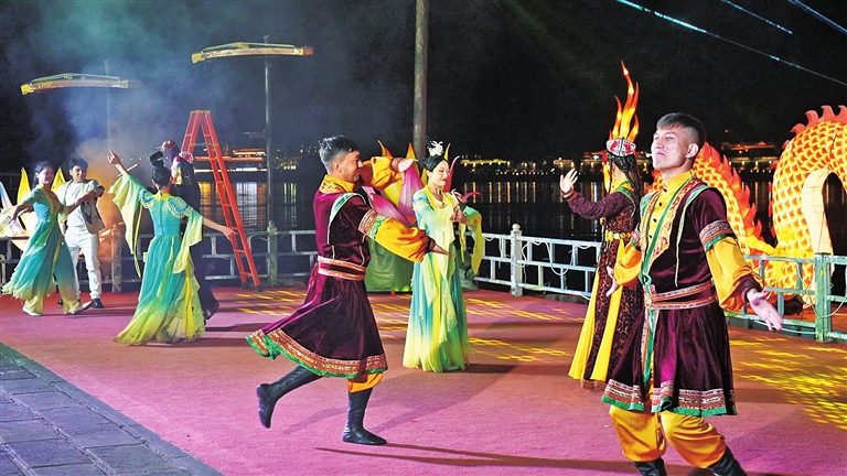 青瓦白墙的古城街巷间,新玉演艺的演员们身着色彩艳丽的服饰,伴随欢快的鼓点翩翩起舞。灵动的舞姿、悠扬的歌声与古城的飞檐翘角相映成趣,既展现了和田文化的热情奔放,又与阆中古城的温婉厚重形成奇妙共鸣,不少游客驻足观赏,纷纷举起手机记录下这一独特的文化场景。
