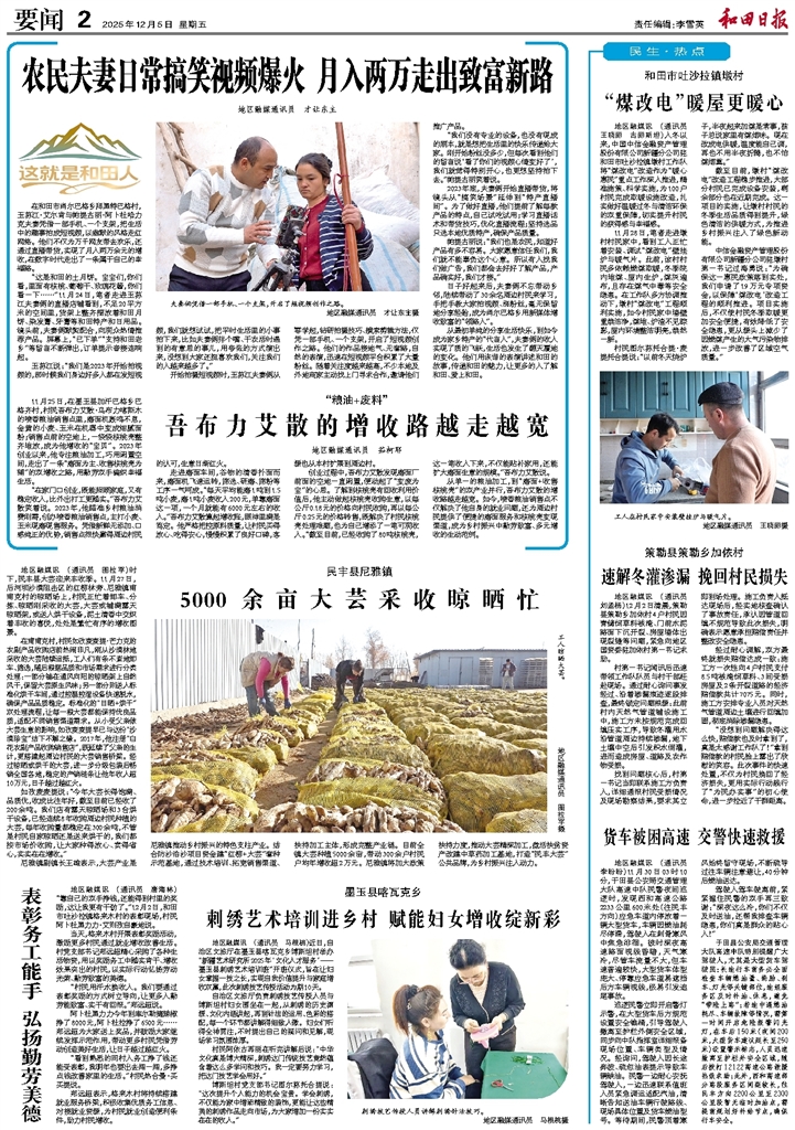 - 5000余亩大芸采收晾晒忙 地区融媒讯 (通讯员 图拉罕)时下,民丰县大芸迎来丰收季。11月27日,后河坝沙漠阻击区的红柳林旁、尼雅镇甫甫克村的晾晒场上,村民正忙着卸车、分拣、晾晒刚采收的大芸,大芸或铺满露天晾晒架,或送