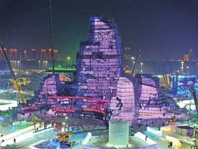 12月10日,第二十七届哈尔滨冰雪大世界主塔“冰灯启梦”封顶,进入最后细节打磨和灯光调试阶段,即将惊艳亮相。据悉,主塔“冰灯启梦”总用冰量39000立方米,是本届哈尔滨冰雪大世界园区最高、单体最大的冰建景观。新华社发 张树摄