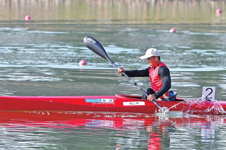 12月9日,新疆队选手周云华在比赛中。最终他获得季军。当日,全国第十二届残疾人运动会暨第九届特殊奥林匹克运动会皮划艇项目男子500米KL1级决赛在广州举行。新华社记者 陈浩明摄
