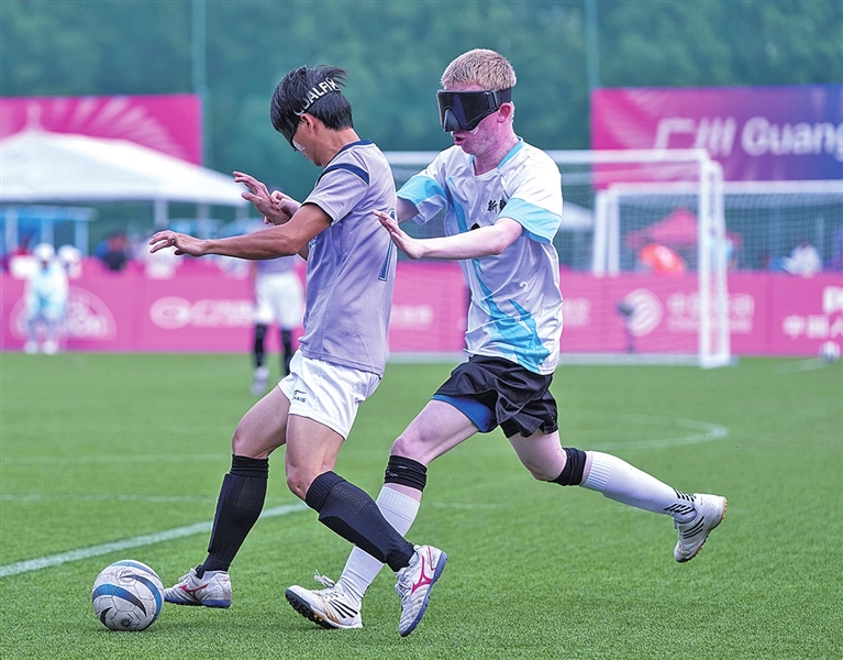 当日,全国第十二届残疾人运动会暨第九届特殊奥林匹克运动会盲人足球项目男子组小组赛在广州大学城足球场进行。