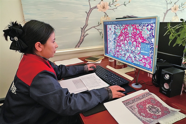 在和田市吐沙拉镇格来木村和田宇宙地毯有限公司,“90后”设计师阿尔孜古丽·穆太力普正将艾德莱斯绸的经典纹样扫描进电脑,用3D建模软件与现代设计理念融合。屏幕上,传统“巴旦木”“红苹果”“浪花”“牡丹”等地毯图案,与极简主义剪贴风格碰撞出奇妙火花,打破了传统地毯纹样的刻板印象。