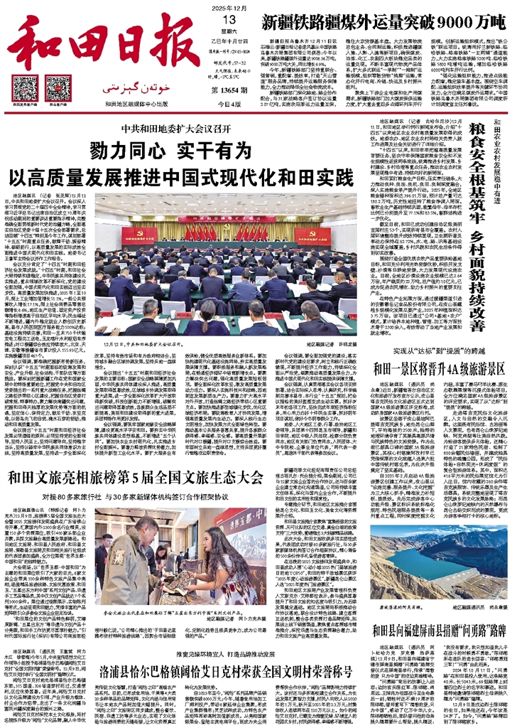 - 勠力同心 实干有为 以高质量发展推进中国式现代化和田实践 地区融媒讯 (记者 张亚辉)12月12日,中共和田地委扩大会议召开。会议深入学习贯彻党的二十届四中全会精神,学习贯彻习近平总书记出席自治区成立70周年庆祝活动期间的重要讲话重要指示精神,完整准