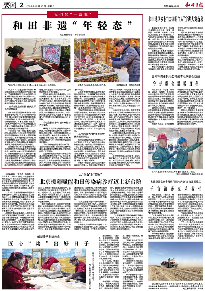- 和田非遗“年轻态” 12月10日,记者走进和田团城,瞬间被琳琅满目的非遗文创产品抓住眼球。艾德莱斯绸制成的新中式马甲、核桃木雕手机支架、铜制文创茶具……这些承载着千年文明的非遗技艺,正以鲜活的“年轻态”走进现代生活,