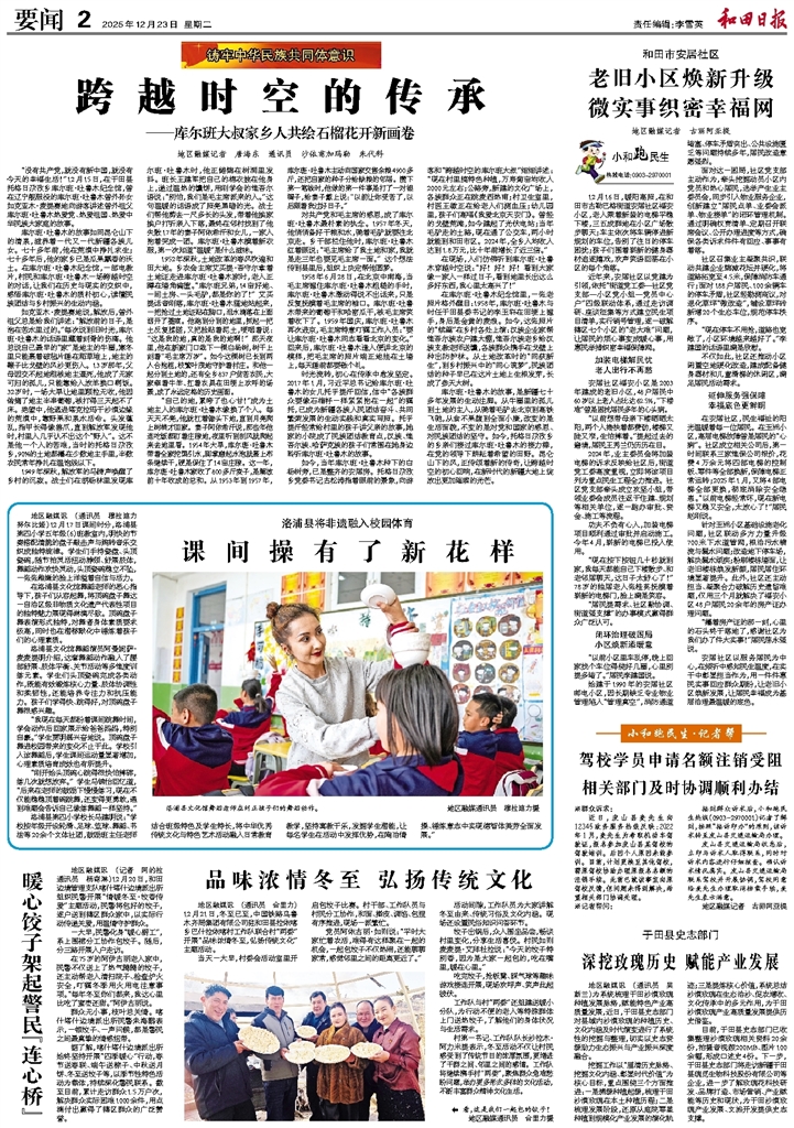 - 老旧小区焕新升级 微实事织密幸福网 12月16日,暖阳高照,在和田市古勒巴格街道安居社区福安小区,老人乘着新装的电梯平稳下楼,三五成群地在小区广场散步聊天;车主依次将车辆停进新规划的车位,告别了往日的停车困扰;孩子们围着崭新的健身器