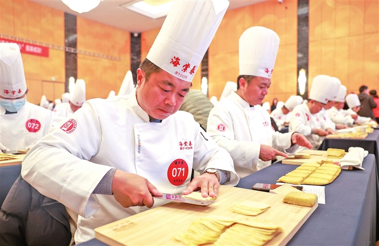 12月23日,泰州早茶“百人炫技千斤丝”非遗传承活动在江苏省泰州市海陵区泰州宾馆举行,百位干丝制作师傅同台献艺,展示泰州早茶中干丝的制作技艺。目前,泰州早茶已形成标准化体系,当地政府将持续深化文商旅融合,助推泰州早茶产业发展。新华社发 顾继红摄