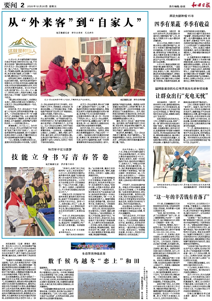 - 从“外来客”到“自家人” 12月19日,冬日暖阳洒满于田县英巴格乡阿亚格兰帕村的乡间小道,于田县文化体育广播电视和旅游局驻村工作队队员艾力·买吐送像往常一样与村干部一道入户走访,了解村民生产生活需求。“阿姨您在家啊,最近家