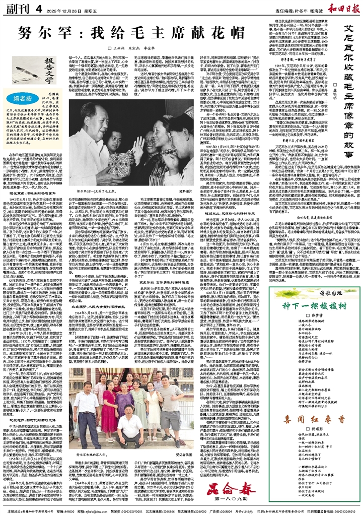 - 努尔罕:我给毛主席献花帽 编者按 花帽映初心,恩情代代传。在毛主席诞辰之日,刊发这篇报告文学,回溯60多年前维吾尔族女青年努尔罕·麦西尔给毛主席献花帽的动人故事。她用一生践行“热爱党、热爱祖国、热爱中华民族大家庭”感恩