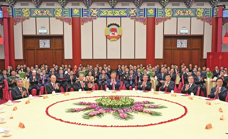文艺工作者现场表演了精彩的节目。最后,全场起立高唱《团结就是力量》。会场内洋溢着喜庆祥和的节日气氛。
