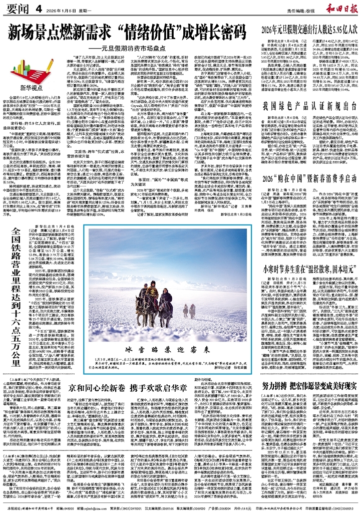 国家电网配备3000多辆移动电源车、1.3万台发电机,筑牢节日电力保障防线;山东菏泽牡丹机场推出个性化帮扶与陪伴服务,保障“一老一小”等群体顺畅出行;安徽合肥市公路中心在重点桥梁和连续弯道路段及时撒布融雪剂,防范结冰隐患;宁夏铁路部门探索“高铁+文旅”融合模式,让列车变成传播地域文化的“流动展厅”……冬日里,各地以温暖服务举措,让群众出行体验更加舒心多彩、便捷安全。