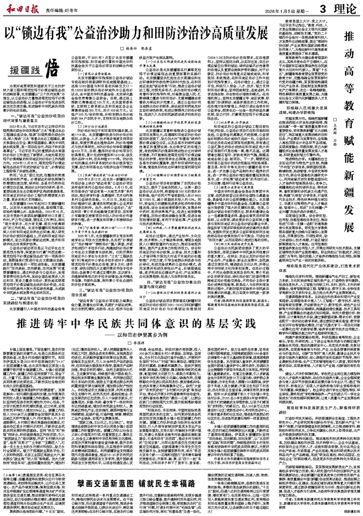 - 以“锁边有我”公益治沙助力和田防沙治沙高质量发展 为更好地贯彻党和国家关于三北防护林六期工程和塔克拉玛干沙漠边缘阻击战的战略部署,北京援疆以“三个双向发展”为理念,以公益治沙力量推进塔克拉玛干沙漠边缘阻击战进程,以公益治沙平台促进各民族交往交流交