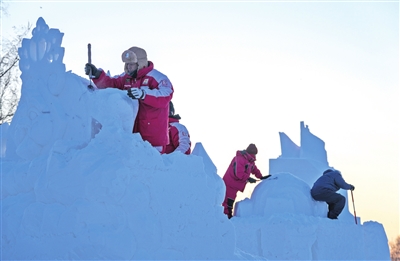 一月七日,在哈尔滨太阳岛雪博会第二十八届中国·哈尔滨国际雪雕比赛现场,选手在进行雪雕创作。