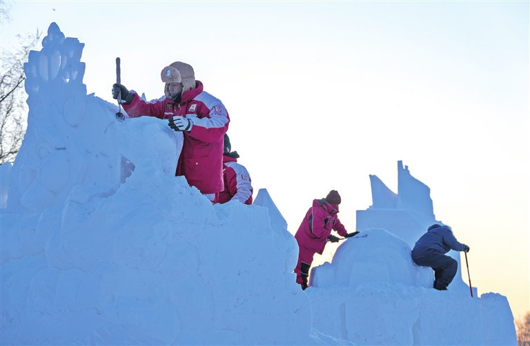 一月七日,在哈尔滨太阳岛雪博会园区,来自十三个国家的二十五支代表队百余位艺术家在寒冬中坚持艺术创作,精雕细琢雪雕作品。