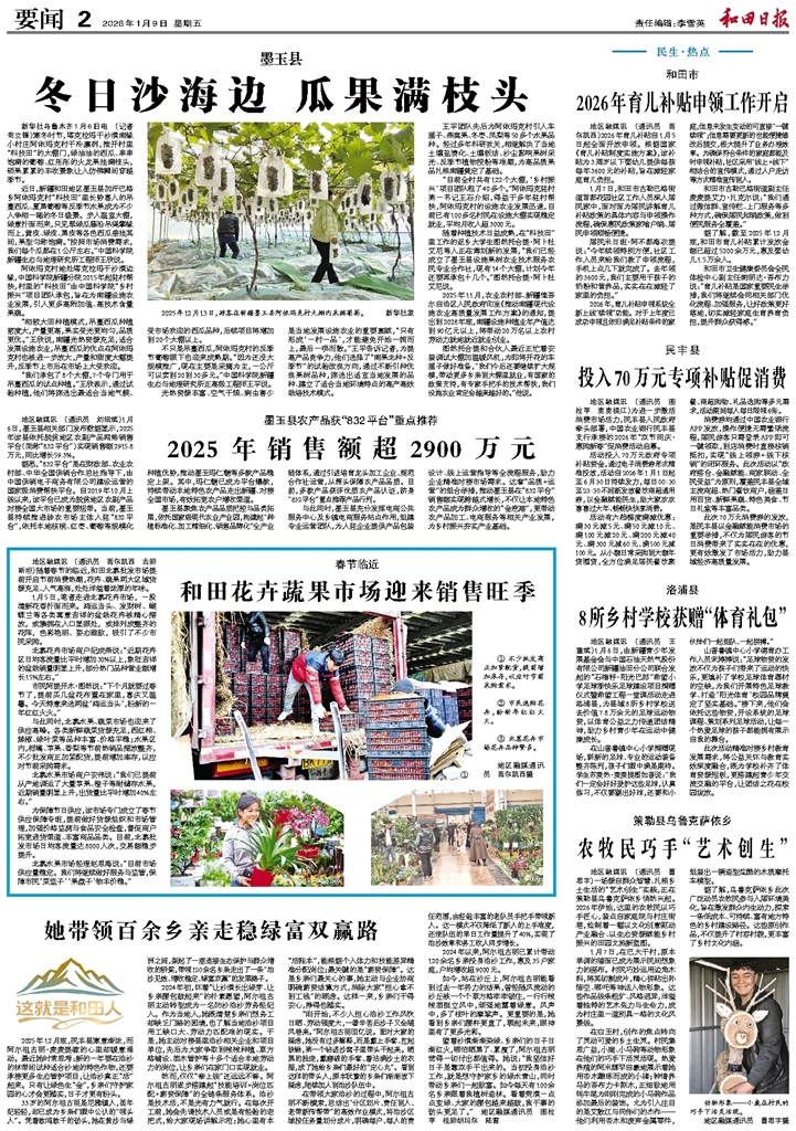- 她带领百余乡亲走稳绿富双赢路 2025年12月底,民丰县寒意渐浓,而阿尔祖古丽·麦麦提敏的心里却暖意涌动。最近她时常思考:新的一年要在治沙的林带间试种适合沙地的特色作物,还要承接更多生态管护项目,让治沙真正“活”起来。只有让绿