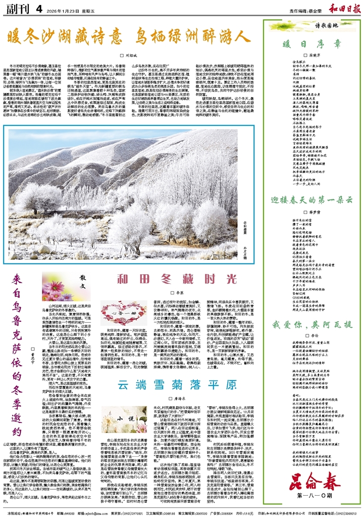 - 和田冬藏时光 和田的冬,藏着一天际的蓝,明亮纯粹、清新舒适。穹庐碧蓝高远,偶有路过的纤云,似棉朵、如羽毛,细腻轻盈地随意铺展,又悄然飘离。掠过胡杨的季风,不裹挟一粒柔软的细沙,不带走一丝清冽色彩。和田的冬,是一