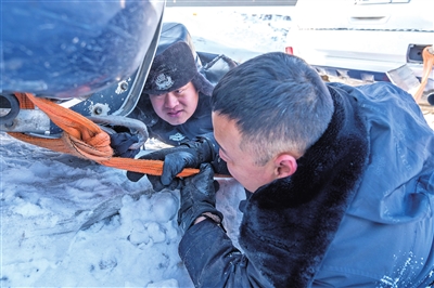 乌鲁木齐铁路公安局乌鲁木齐公安处乌拉泊站派出所民警在救援抛锚警车(1月19日摄)。新华社发 叶帅摄