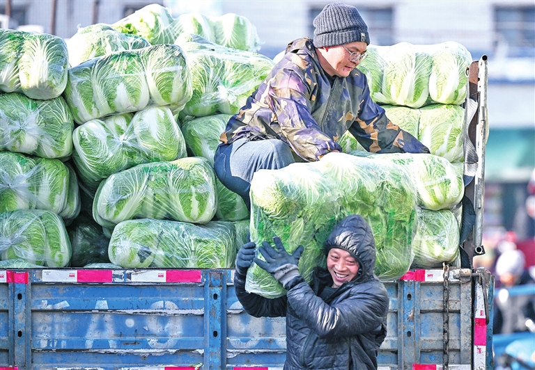 1月21日,工作人员在位于乌鲁木齐市沙依巴克区的凌庆蔬菜批发市场搬运蔬菜。新华社记者 王菲摄