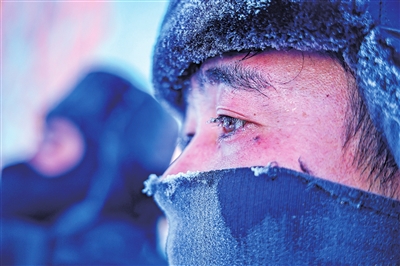 在新疆阿勒泰地区富蕴县吐尔洪乡,在巡检的供电所员工脸上凝结冰霜(1月16日摄)。新华社发 努尔别克·努尔曼摄