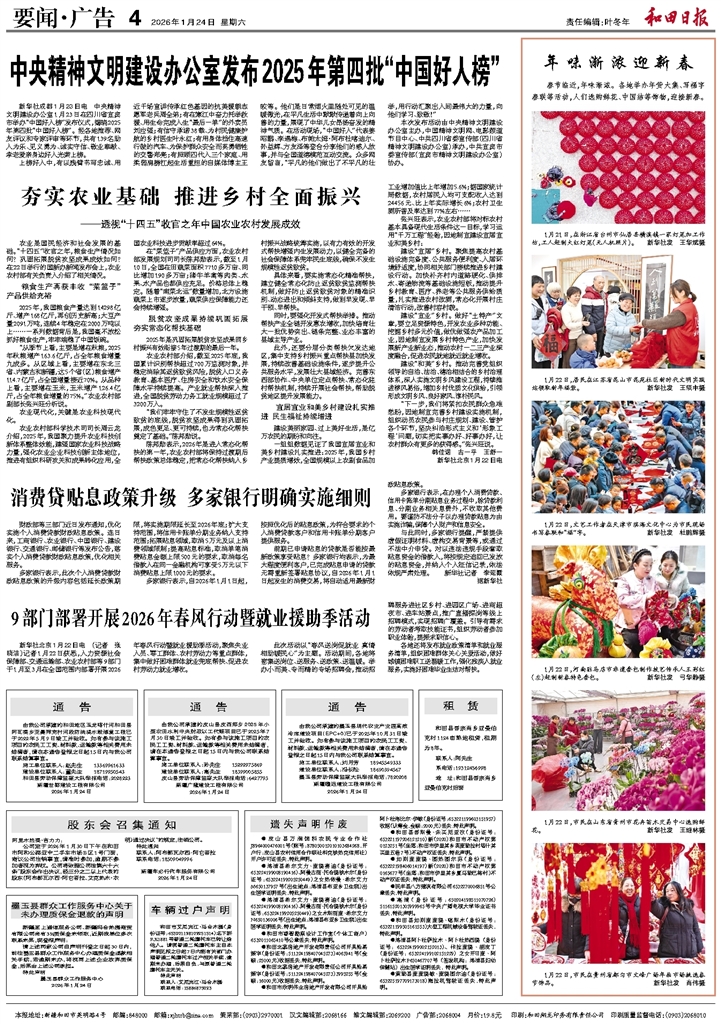 - 中央精神文明建设办公室发布2025年第四批“中国好人榜” 新华社成都1月23日电 中央精神文明建设办公室1月23日在四川省宜宾市举办“中国好人榜”发布仪式,揭晓2025年第四批“中国好人榜”。经各地推荐、网友评议和专家评审等环节,共有139名助人为乐、