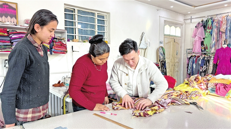 非遗传承的同时,也带动乡亲们增收,工作室员工苏麦耶·热合曼便是受益者之一。苏麦耶说:“刚来的时候什么都不敢上手,生怕弄坏布料。”在阿卜杜哈力克指导下,苏麦耶掌握了艾德莱斯裁缝技艺,现已能独立完成复杂款式制作。