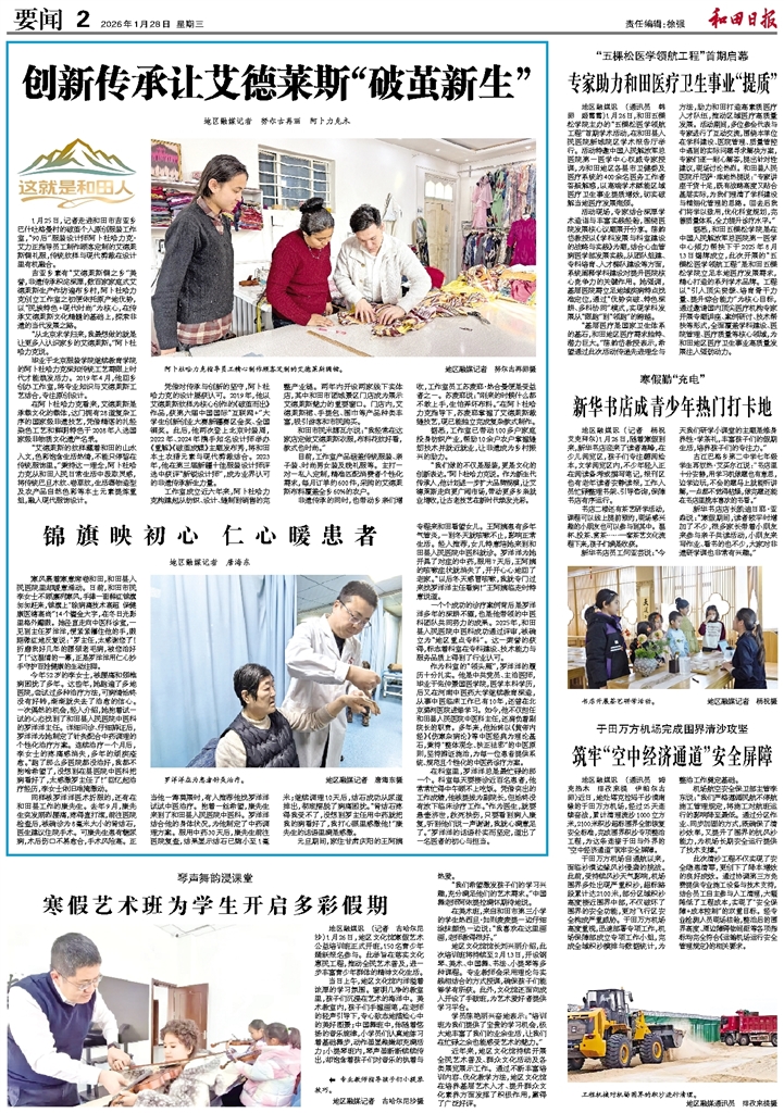 - 创新传承让艾德莱斯“破茧新生” 1月25日,记者走进和田市吉亚乡巴什吐格曼村的破茧个人原创服装工作室,“90后”服装设计师阿卜杜哈力克·艾力正指导员工制作顾客定制的艾德莱斯绸礼服,传统纹样与现代剪裁在设计里有机融合。 吉亚乡