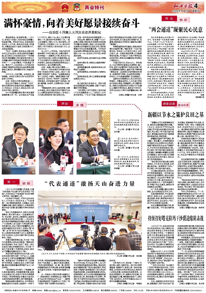 - “两会通道”凝聚民心民意 2026年新疆两会在乌鲁木齐召开,“委员通道”“代表通道”相继开启。今年是“十五五”开局之年,也是新疆第二年开设“两会通道”,12位来自基层的人大代表和政协委员分别走上“两会通道”,紧扣新疆经济社