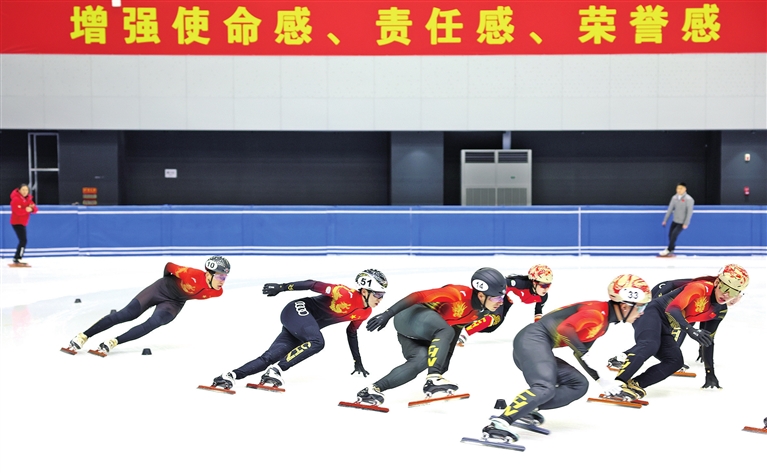 1月29日,米兰冬奥会中国体育代表团短道速滑队在国家体育总局冬季运动管理中心综合训练馆冰坛进行训练,备战即将到来的米兰冬奥会。
