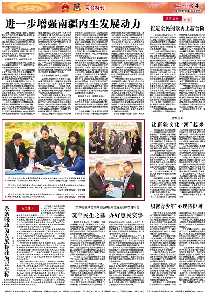 - 筑牢民生之基 办好惠民实事 新疆日报乌鲁木齐1月29日讯 (石榴云/新疆日报记者 李嘉妮)1月29日下午,2026新疆两会举行第四场新闻发布会,主题为“筑牢民生之基 办好惠民实事——解读自治区政府工作报告”,与民生相关部