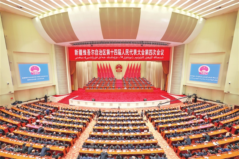 一月三十一日,新疆维吾尔自治区第十四届人民代表大会第四次会议在新疆人民会堂闭幕。石榴云/新疆日报记者 崔志坚摄