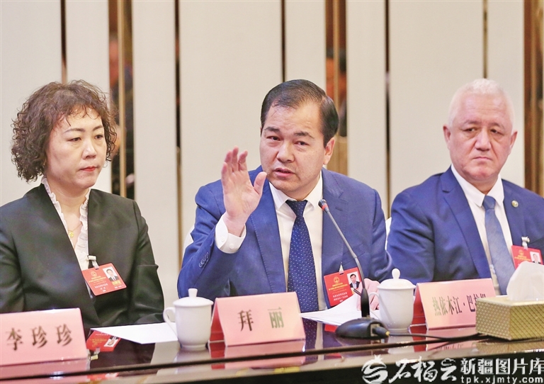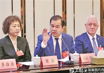 ② 1月30日,热依木江·巴拉提代表(中)在参加乌鲁木齐代表团审议时,就食品安全内容发言。天山网-新疆日报记者 李瑞摄