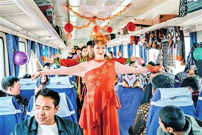 列车启动不久,和田新玉歌舞团演职人员便在车厢中部即兴来了一场小型歌舞表演,欢快的旋律与优美的舞姿,迅速点燃了车厢气氛。乘客拿起手机,记录下旅途中的温馨一幕。