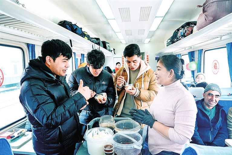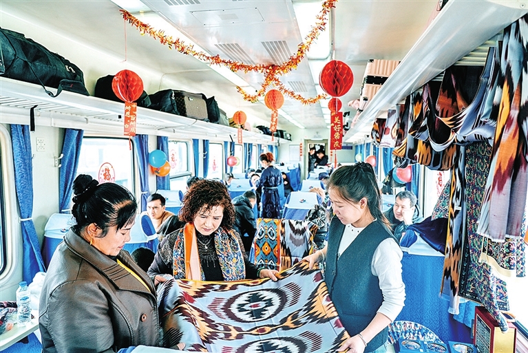 歌舞表演告一段落,车厢内政策宣讲员用亲切生动的语言,向旅客讲述和田的发展故事。旁边不远处,临时搭建的“列车年货集市”同样人气十足。酸奶粽子、蜂蜜等琳琅满目的和田特产摆满展台,吸引旅客品尝购买。